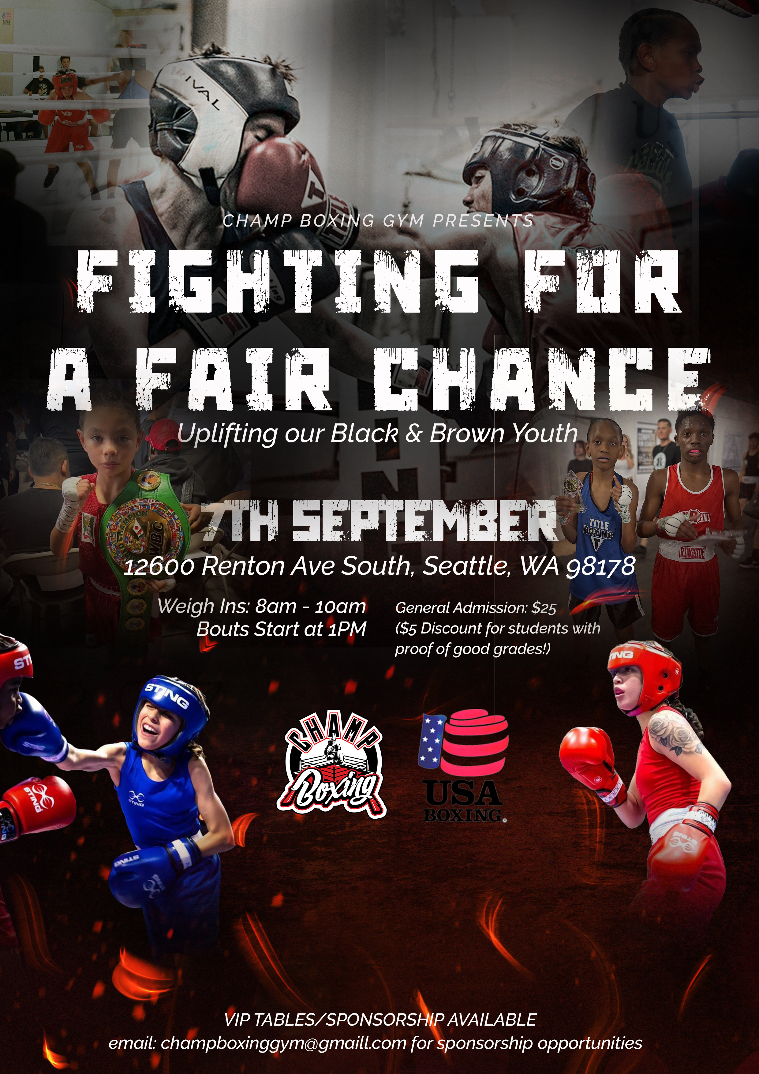 Fighting for a Fair Chance is a night of uplifting and supporting our Black & Brown Youth! This show will showcase our talent and we have partnered with the Breakfast Group to give out college scholarships to our athletes.