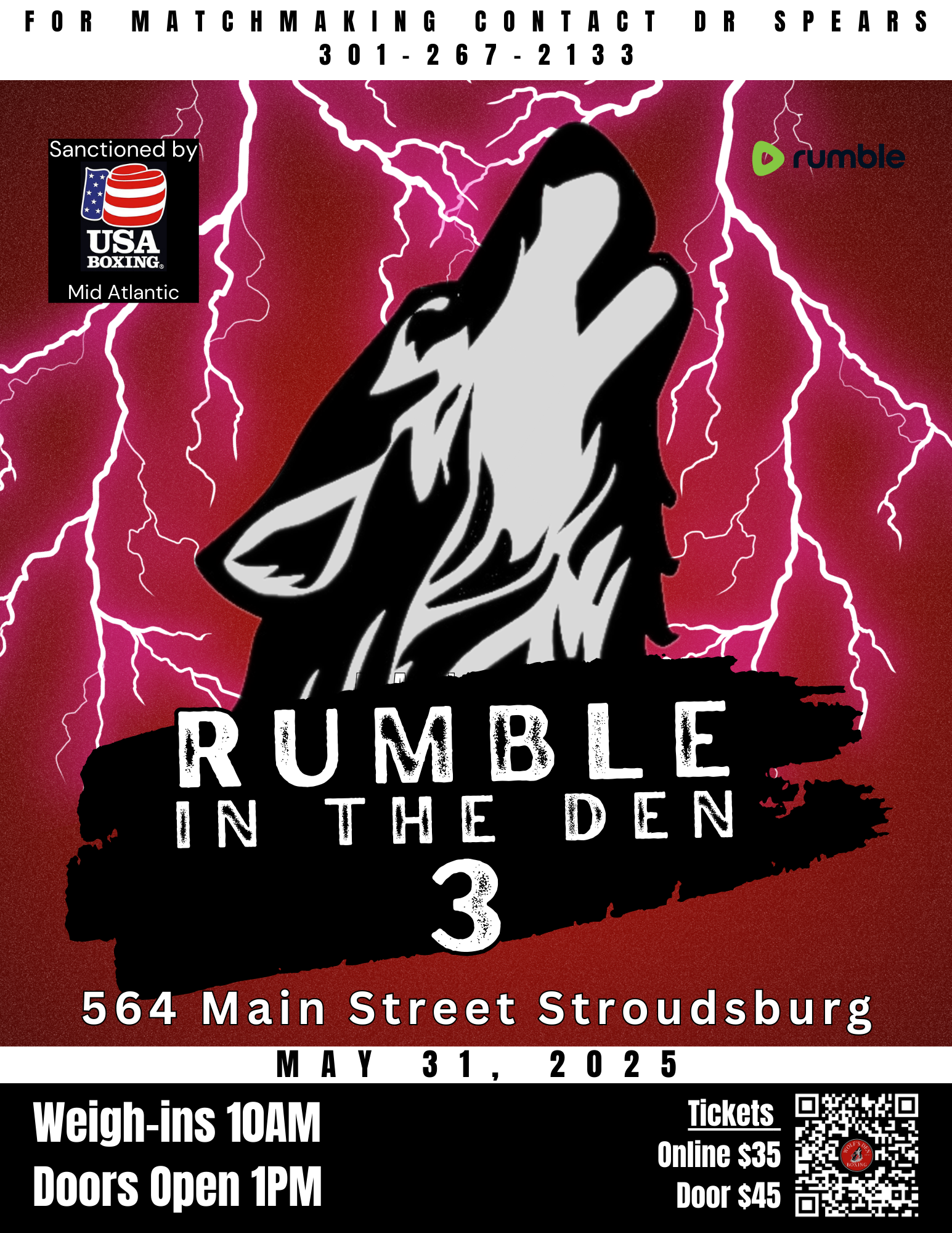 Matchmaking by Dr. Joe Spears 301-267-2133 Weigh-ins 10AM Doors open 1pm Purchase tickets at https://wolfsdenboxing.ticketspice.com/rumbleintheden3