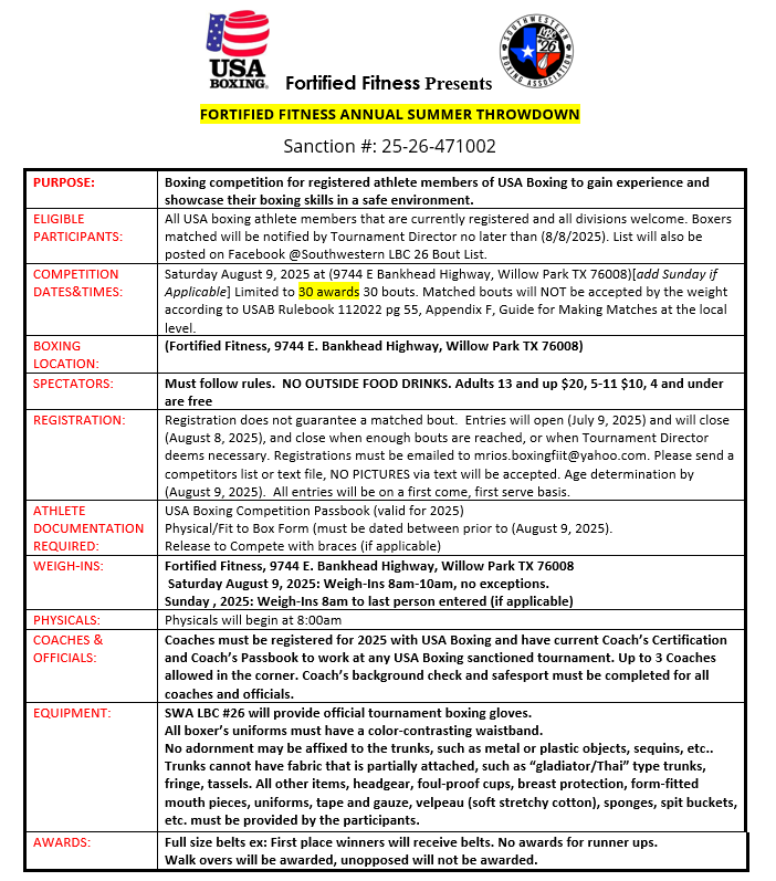 Fight with the feel of being on a Top Rank World Championship card. Full light truss, DJ, walk out music, Snack bar, full cash bar, Championship belts for all winners and 6 different trophies. This will be the coolest tournament of the year!