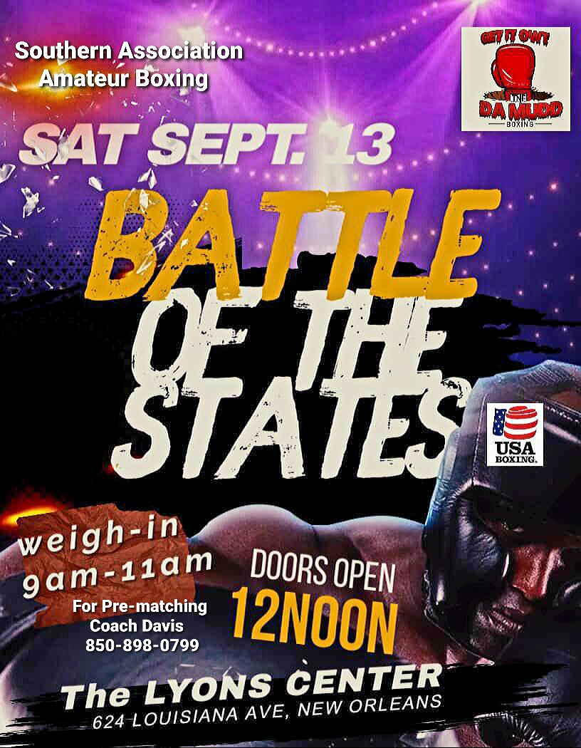 ?? Pre-matching Now.. **Coaches send your roster to Coach Davis ** Battle of the States #BattleOfTheStates ?? #SATURDAY #SEPTEMBER 13TH ?? weigh ins from 9am - 11am ?? Doors open at 12 noon ?? 1st match at 1pm @ Lyons Recreational Center 624 Louisiana Ave New Orleans, Louisiana and |