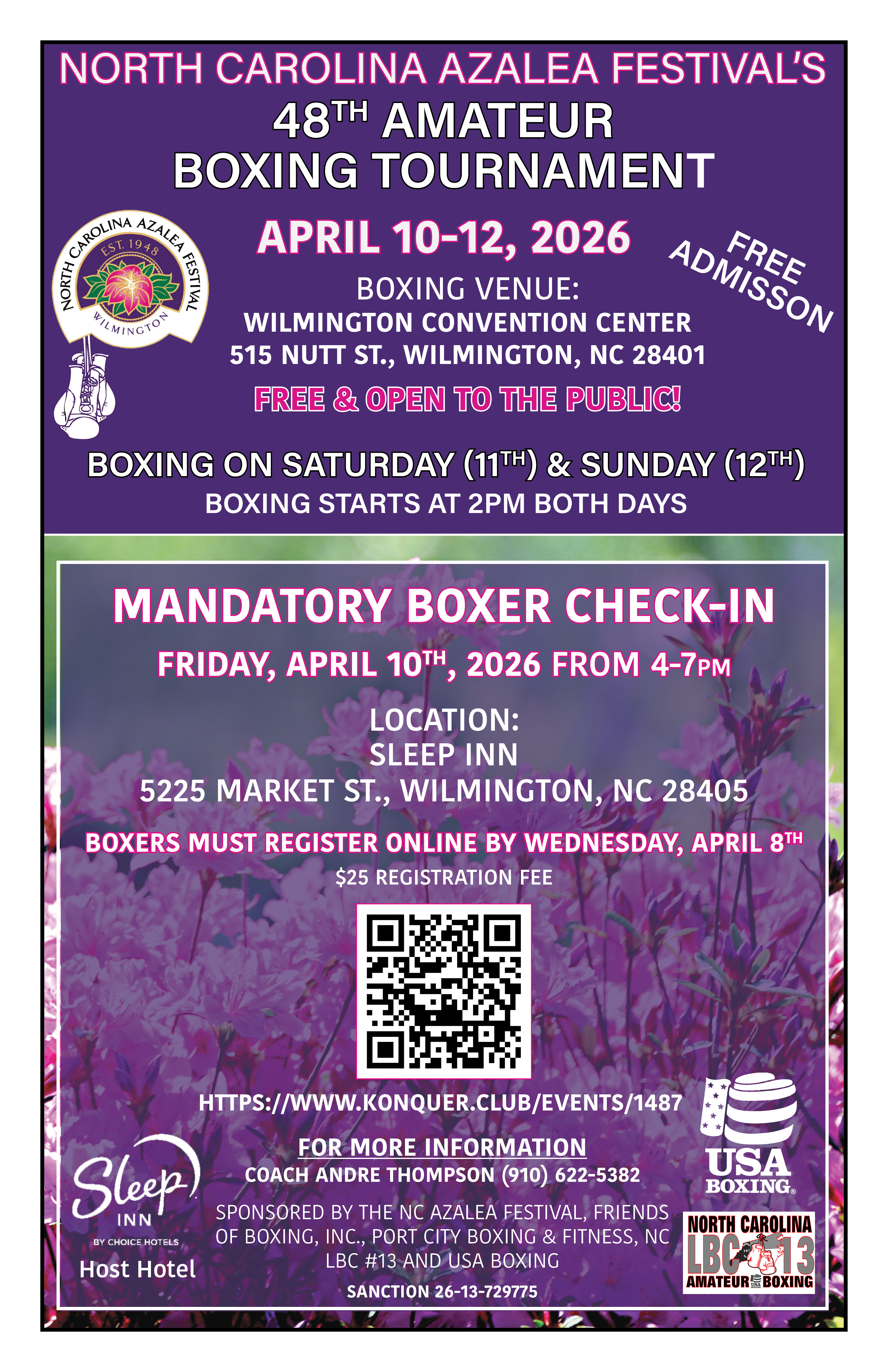 The North Carolina Azalea Festival Boxing Tournament, presented by the NC Azalea Festival and US Army, will be held Saturday- Sunday, April 11th and 12th, with check-ins on Friday, April 10th..The event showcases some of the finest boxers from the National and International level of competition & from the military branches. Boxers age 8-16 and 17-34 and Master Boxers 35-up compete in six divisions from 55lb-201lb+. Participation in the past has come from North Carolina, South Carolina, Georgia, Florida, New Jersey, Maryland, Washington D.C., Pennsylvania, and more from around the country. This is a USA Boxing Sanctioned Tournament.Boxers can register by visiting the NC Azalea Festival Boxing Tournament website. Boxer Registration is $25. Boxers must register online by Wednesday, April 8th, 2026.